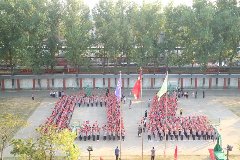 在《歌唱祖国》音乐声中,全体师生手持小国旗自由快速进入操场站成一个硕大的“70”,盛世华诞!“70”有我!