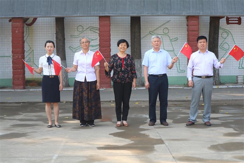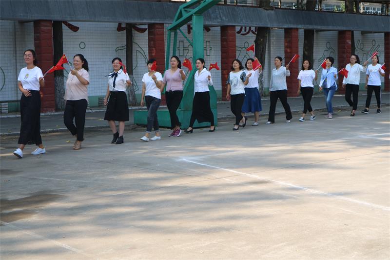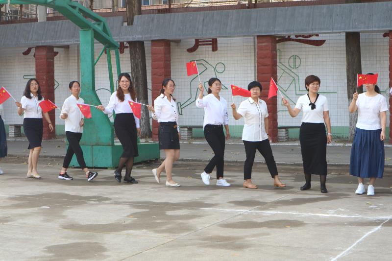 全校师生伴随音乐节奏挥动手中的小国旗,操场变成了红色的海洋。